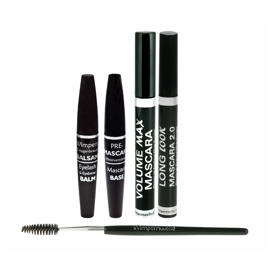 1 x BALSAM pentru gene și sprâncene, 1 x PRE-Mascara, 1 x rimel VOLUME MAX, 1 x rimel LONG LOOK 2.0 și 1 x perie pentru gene într-o pungă cosmetică