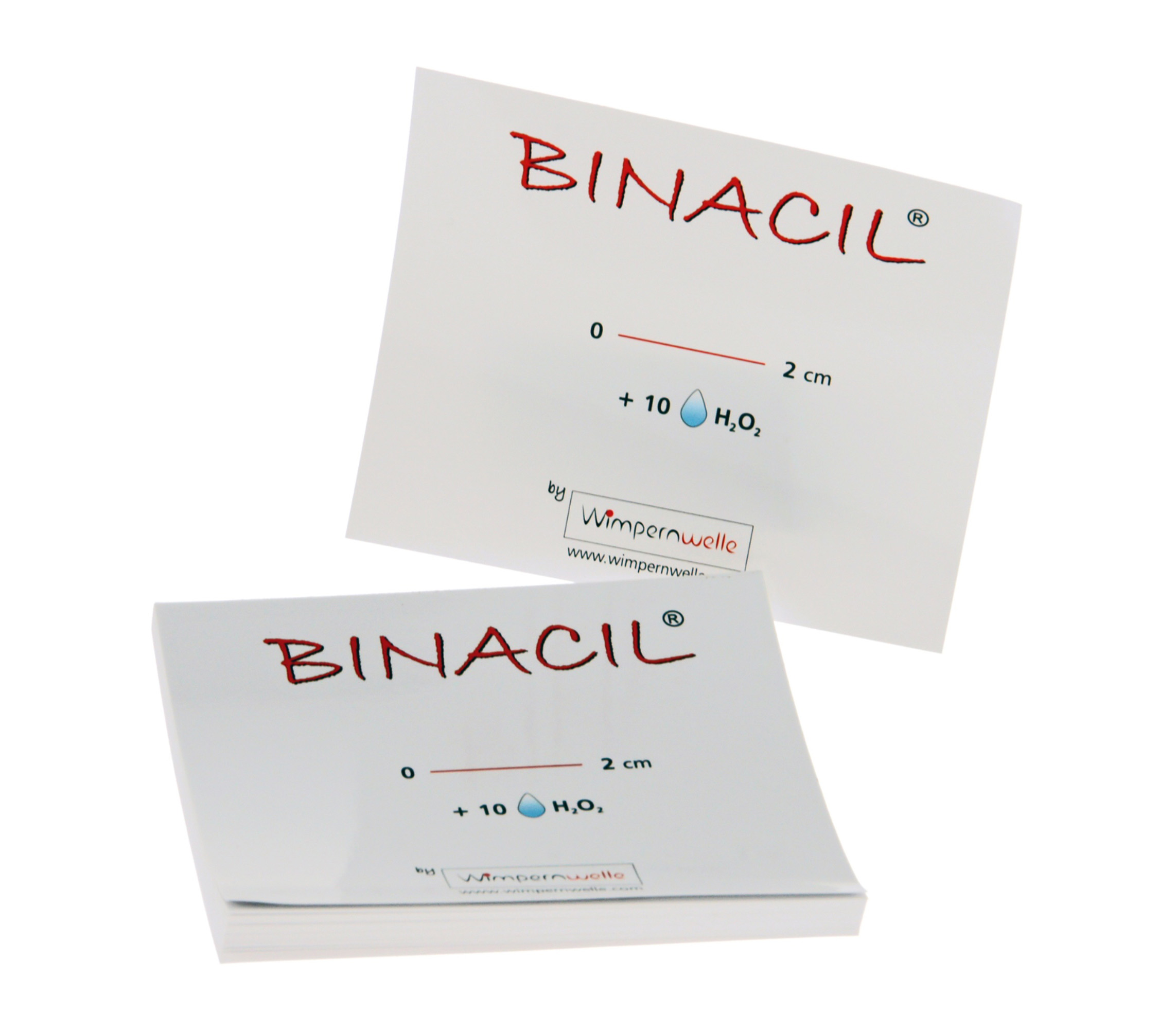 10 picături de oxidant cremă BINACIL® sunt amestecate cu 2 cm de vopsea BINACIL® pentru gene și sprâncene pentru a forma o cremă de vopsit de 1,5%, de ex. foarte igienic și curat pe blocul de amestec BINACIL® (nr. art. 23967).