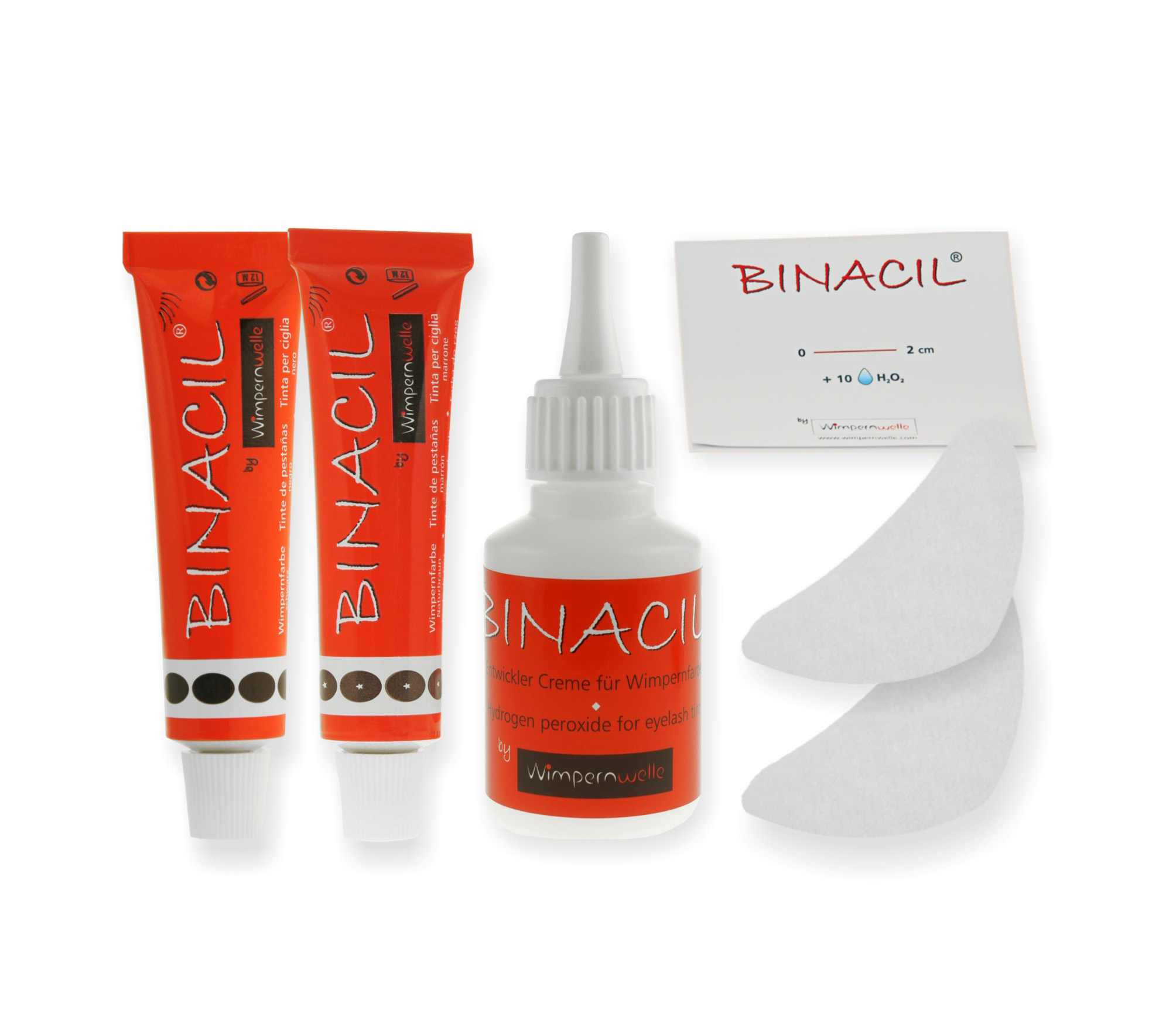 2 tuburi de 15 g de vopsea BINACIL® pentru gene și sprâncene (negru și maro natural cu bețișor pentru amestecare și aplicare BINACIL®), 20 ml cremă oxidant BINACIL®, 24 dischete de protecție BINACIL®, 1 bloc de amestec BINACIL® (10 foi)