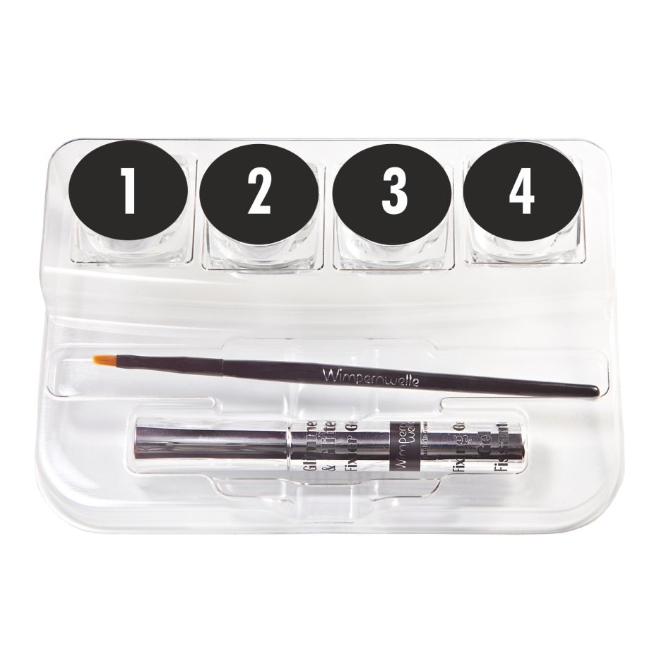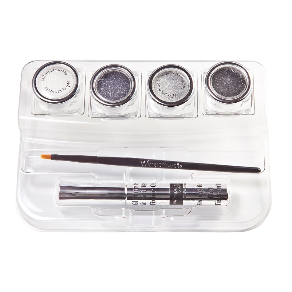 Glimmer & GlitterBAR cu 4 farduri (alb ca zăpada, argintiu, platină, negru), gel de fixare și pensulă de aplicare