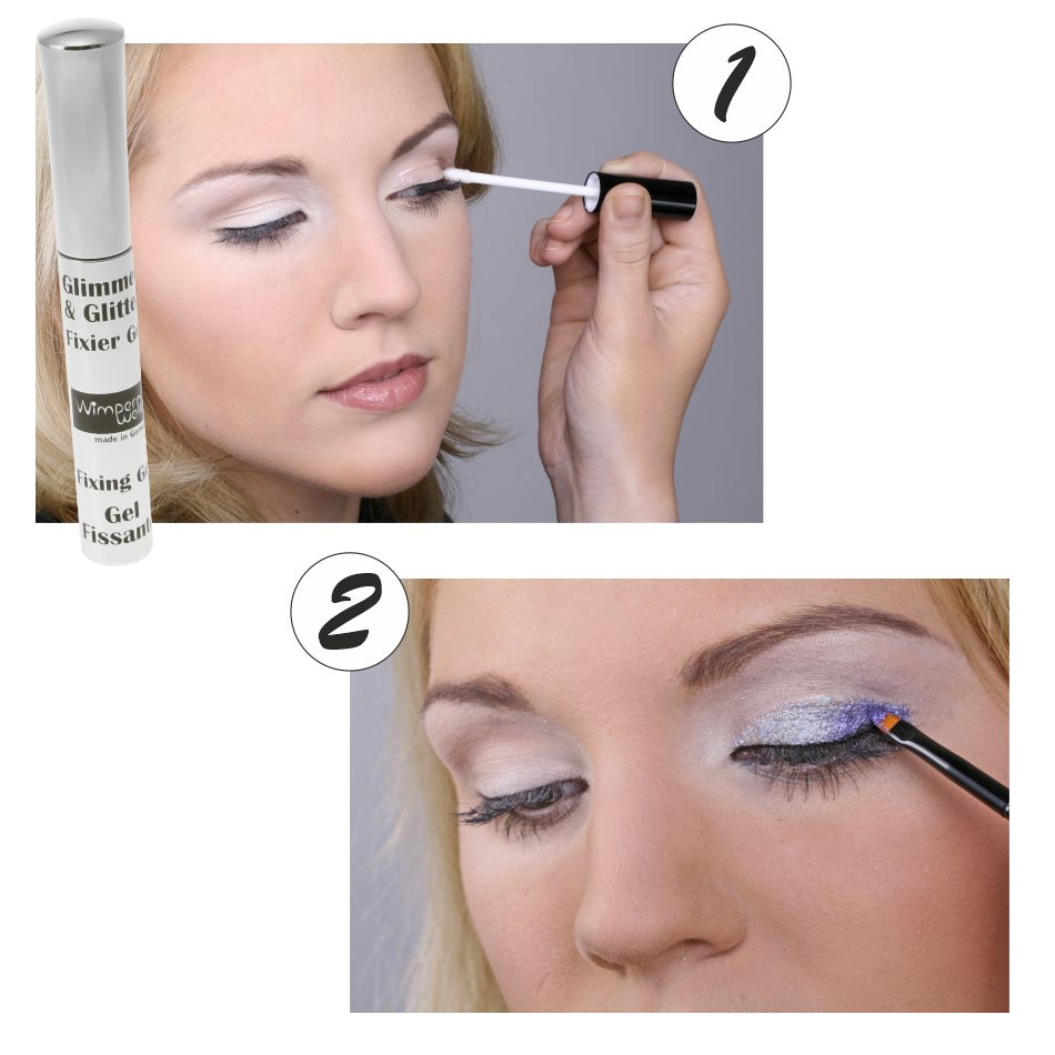 Étape 1 : Appliquez le Glimmer & Glitter Gel fixateur comme base adhésive : sur une grande partie, seulement comme eye-liner ou également sur un maquillage existant.